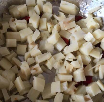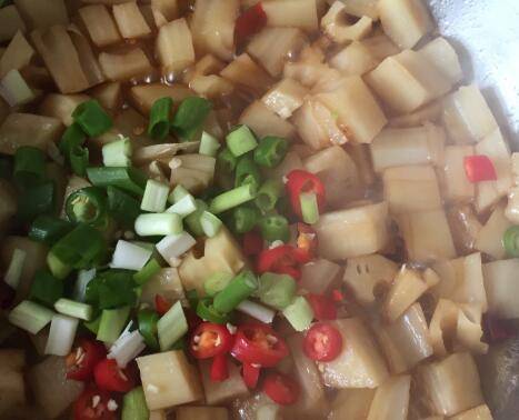 锅里放入油小火爆香干辣椒,放入藕丁炒半分钟,放上料汁炒匀。