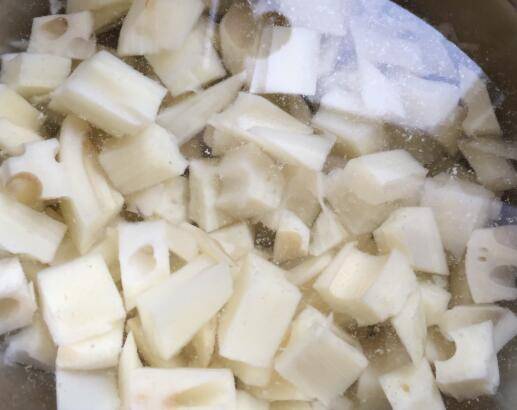 水开放入藕丁焯水1分钟,藕丁捞出到冷水中。