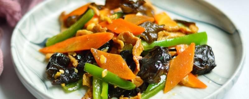 最佳答案用料:猪肉300克,胡萝卜50克,干木耳8克,青椒1个,蒜2瓣,酱油1汤匙,料酒1汤匙,淀粉1茶匙,盐1小勺。1、木耳用温水泡发,泡发好后冲洗干净,撕成小块待用。2、猪肉切成丝,放入盘中,用少许淀粉和酱油腌制一会儿。3、胡萝卜和青椒切片,蒜拍碎,剥去外皮后切末。4、锅里烧热油,放入肉丝快速炒...