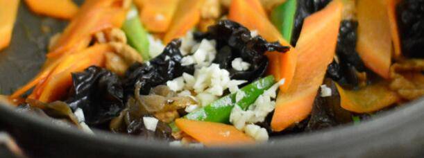 6、加入胡萝卜和木耳一起拌炒,炒至断生。