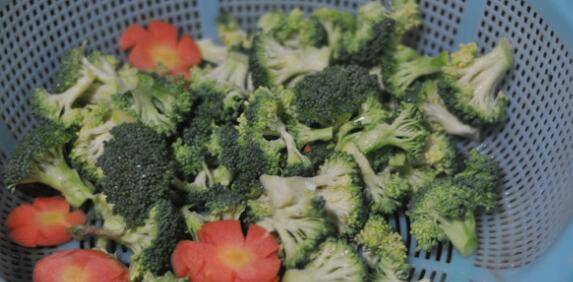 1、西兰花用手掰成一个个小花簇,胡萝卜切成薄片,修成花瓣状。