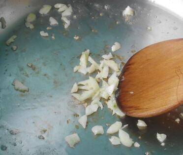 5、炒锅中加入花生油烧热,放入拍碎的蒜炒出香味。
