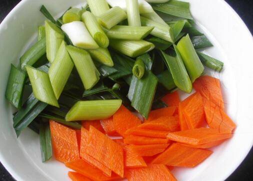 3、胡萝卜削皮后切菱形片;青蒜切段;蒜拍碎。