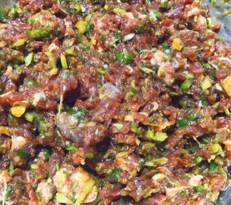 驴肉洗净用料理机打成肉泥,芹菜洗净用料理机打成菜馅,小葱打成葱花,全部混到一起。
