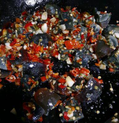 蒜头切碎,辣椒切碎备用。皮蛋剥壳,用刀或者线切成小块。