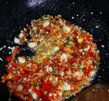 热锅下油,把蒜头、辣椒碎加盐炒香炒熟,大概1分钟。