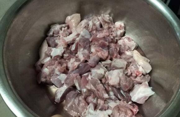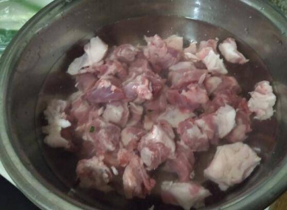 3、羊肉清洗干净后切成小块,继续浸泡。