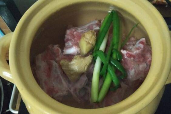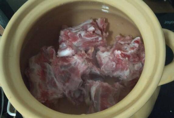 2、在锅中倒入足量的清水,先把羊骨头放入锅内。