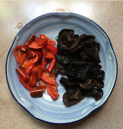 泡发好的黑木耳摘洗干净,红椒去籽切块。