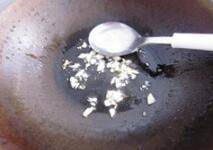3、热锅冷油下蒜蓉炒香。
