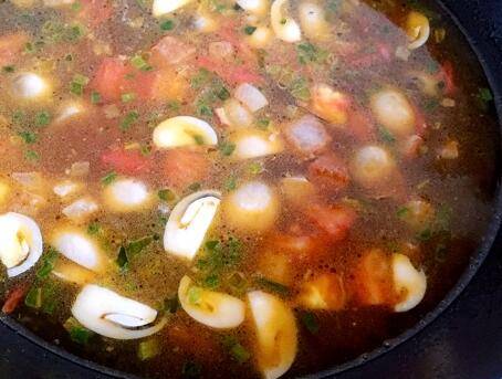 放热油,加入蒜片和葱末爆香,爆香后加入西红柿翻炒出汁。