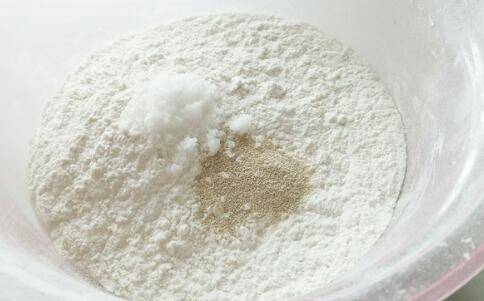 1、面粉中加入发酵粉、砂糖拌匀。