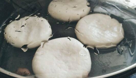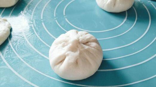 7、取一个剂子按扁,中间放馅,包成包子样。