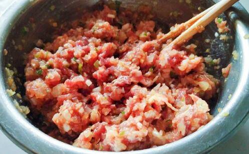 5、萝卜剁碎末,猪肉剁肉泥,葱、姜剁碎,放入所有的调料,搅拌成馅。