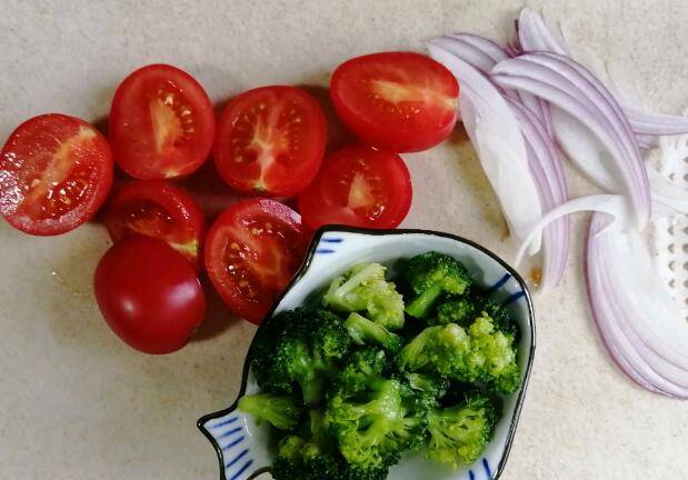 1、洋葱切细丝,小番茄对半切,西兰花焯水,掰成小花备用。