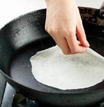 7、薄饼变色且边缘微微翘起时,即可出锅,用锅铲或直接用手指捻起边缘,揭出饼皮。
