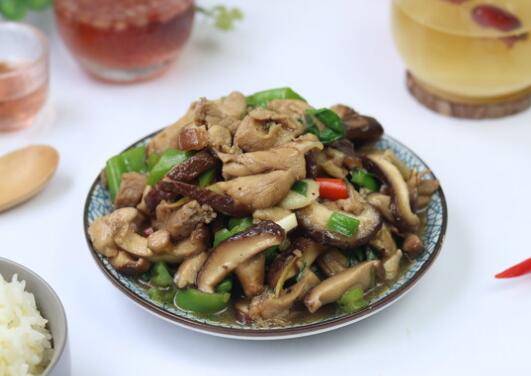准备食材:鸡腿、香菇、青椒、食用油、盐、生抽、味极鲜、黑胡椒粉、小米椒、香叶、花椒、小茴香、大蒜、姜。