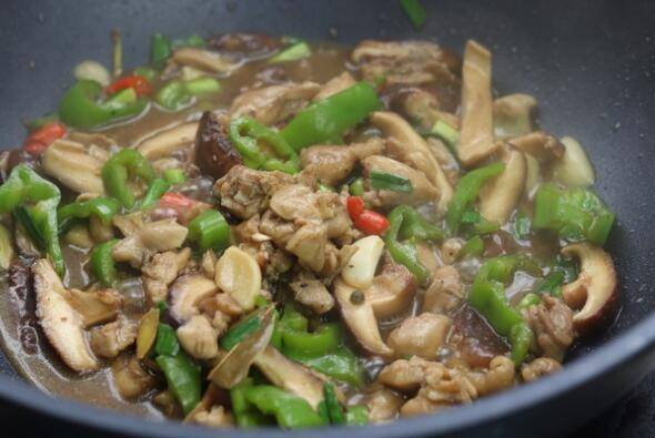 继续焖煮至汤汁浓稠、鸡肉熟透。