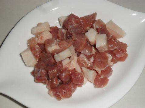 5、锅中放油,倒入猪肉炒至快熟,加入葱、花椒、辣椒煸炒出香味。再加入少许酱油。
