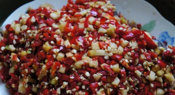 7、放一层腌制好的剁椒酱。