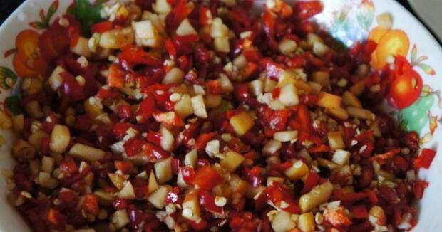 4、尖椒、大蒜切碎,切一点苹果碎。