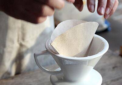 5、把磨好的咖啡粉放入滤纸中,围绕滤杯中心绕圈缓缓注入水,烘焖蒸15秒。