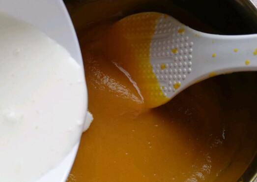 3、南瓜泥倒入锅中加入牛奶,加入淡奶油。