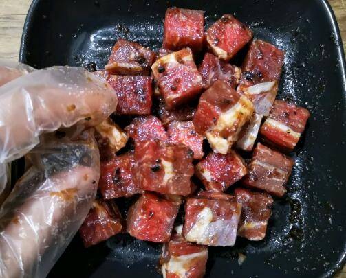 牛肉粒加入适量的牛排酱,抓拌均匀。前半小时每10分钟抓拌一下,给牛肉粒做个全身按摩,盖保鲜膜放进冰箱冷藏一夜入味。