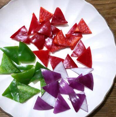 彩椒、洋葱洗净切滚刀片备用。