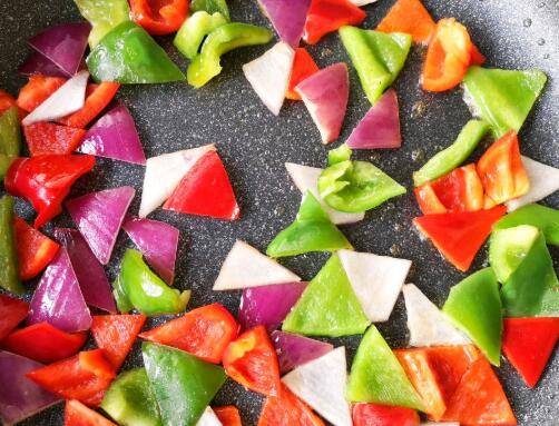 锅中适量橄榄油烧热,下入彩椒和洋葱爆炒断生后盛出备用。