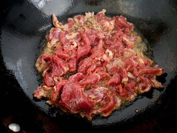 4、热锅冷油。放入腌好的牛肉爆炒。