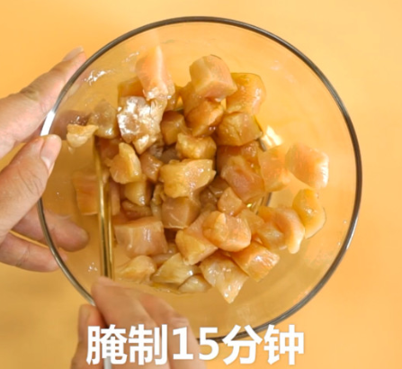 倒入黄瓜丁、胡萝卜丁、调好的汁;