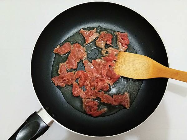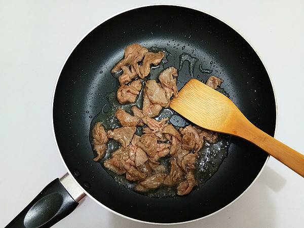 5、锅中放宽油,油温五六成热放入腌制好的牛肉翻炒。