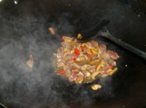 下油,放进辣椒、鸡肾和姜丝煸炒;