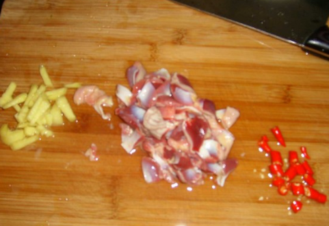 辣椒切块,鸡肾切块,姜切丝;