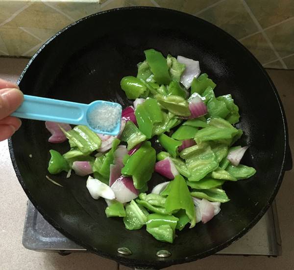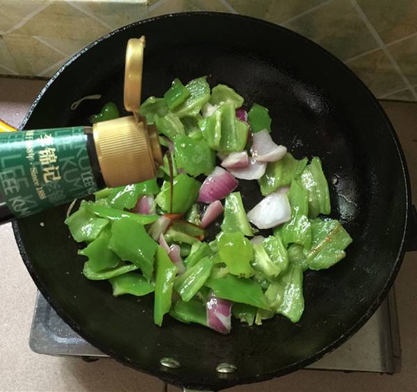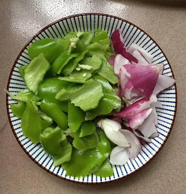 8、锅中留底油,下青椒,洋葱块。