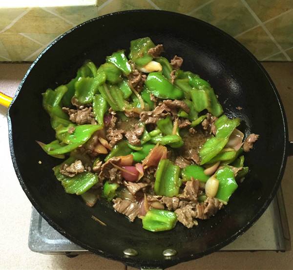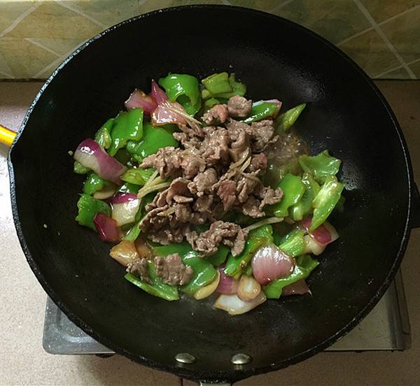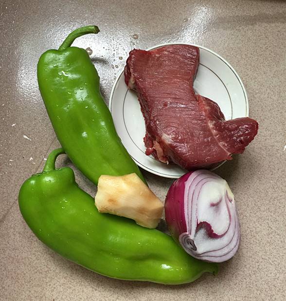 用料:牛里脊肉220克、青椒200克、洋葱60克、生抽酱油10毫升、蒸鱼豉油10毫升、料酒10毫升、生粉2克、生姜5克、精盐3克、原味鲜1克、食用油30毫升。