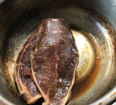 4、由于肉吸收了酱料,短时间煎制能让汁水流失很少,所以肉质非常嫩,一分钟就煎好了四片牛肩肉。