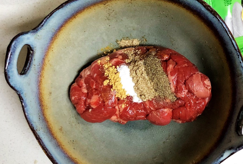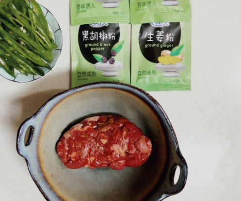 2、嫩肉粉半勺,让牛肉保持嫩气,生姜粉半勺,去腥,椒盐粉半勺增味,黑胡椒粉1勺提香加辛口味。