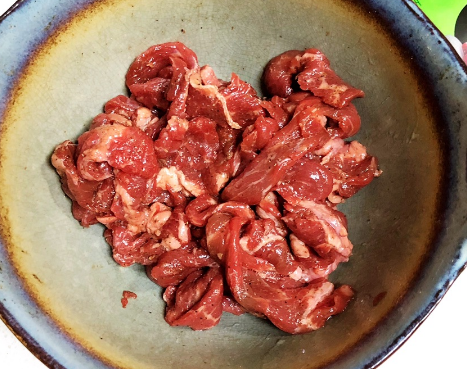 1、牛肩肉几片、生抽一勺、料酒一勺、糖一勺、生粉少许、食用油一勺。