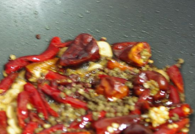加入辣椒,花椒,红油、洋葱块一起炒香。