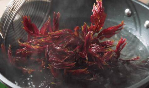 2、入锅后香椿会立刻变成翠绿的颜色,焯水20秒左右即可捞出。