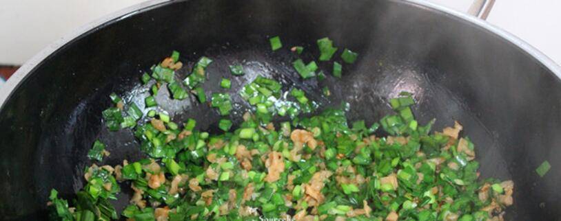 5、把切碎的韭菜倒入锅,大火翻炒,一定要大火,这样炒的韭菜才香,叶子不会黄。
