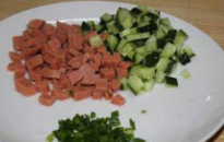 青瓜跟火腿肠切小丁,小葱切末。