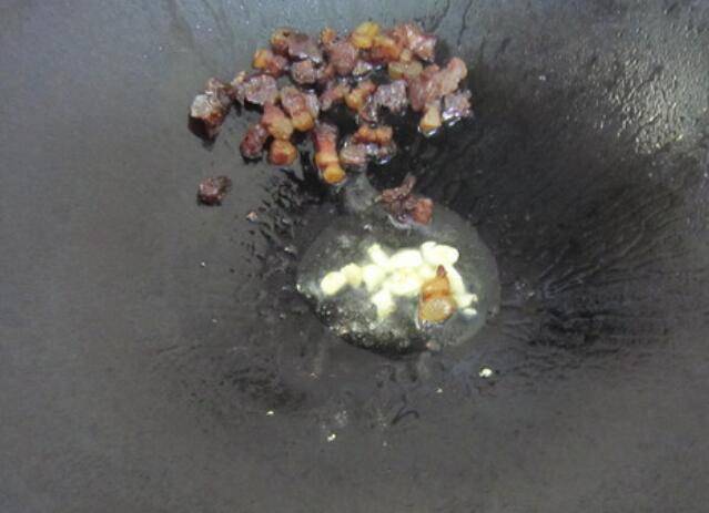4.油多的话去掉一部分,把腊肉拔锅边,下蒜粒爆香。