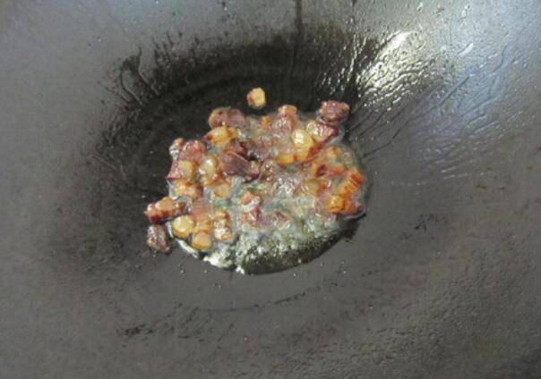 3.锅中放植物油润锅,把腊肉下锅煸炒出油。