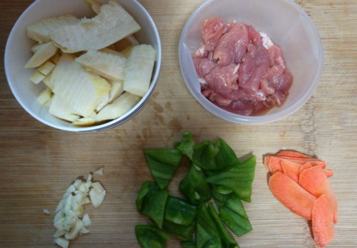 2、将冬笋去除外皮后切片,然后用水焯一下,这样可以去除它的涩味,而且缩短炒的时间,猪肉切片后用少量盐和淀粉拌匀,这样炒出来的肉嫩而不老,而且很入味,胡萝卜切片,青椒切块,大蒜切碎。