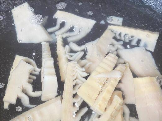 4、烧一锅开水,下冬笋片焯2-3分钟,淡化冬笋本身的涩味,然后捞出过凉水沥干。