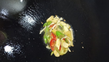 3、腊肉煸至透明后盛出,锅中留下煸出的油脂,炒香葱姜蒜,青红辣椒。