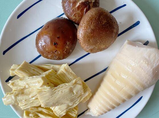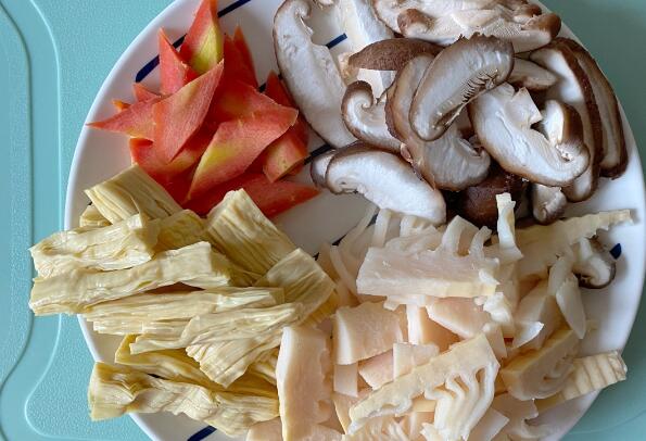 3、香菇、冬笋胡萝卜切片,腐竹切段。